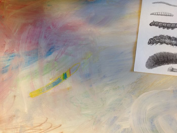 Nous dessinons, peignons, sculptons… à l’aide de toutes sortes d’outils. Les crayons deviennent aquarelle. Le pastel se mélange à l’encre. Les pinceaux trempent dans la gouache ou la colle. Des branches se mélangent au papier ou à des brins de laine pour devenir statuettes. Et la terre prend la forme d’un joli dessert dans un bol en verre.